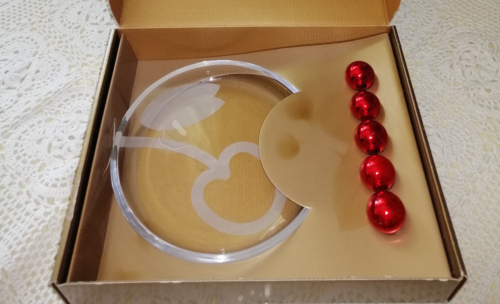 Poslovno darilo, ki je bilo narejeno dolgo nazaj s strani ajdovske oglaševalske agencije Aladin, s katero sem veliko sodelovala. Takrat je direktorica in izjemna kreativka Lučka Peljhan tole oblikovala in napisala za naročnika tudi besedilo pesmi Sanjam zrele češnje, ki sem jo odpela in je bila pravi hit. Predmet nosi v sebi lepo zgodbo in sodelovanje.