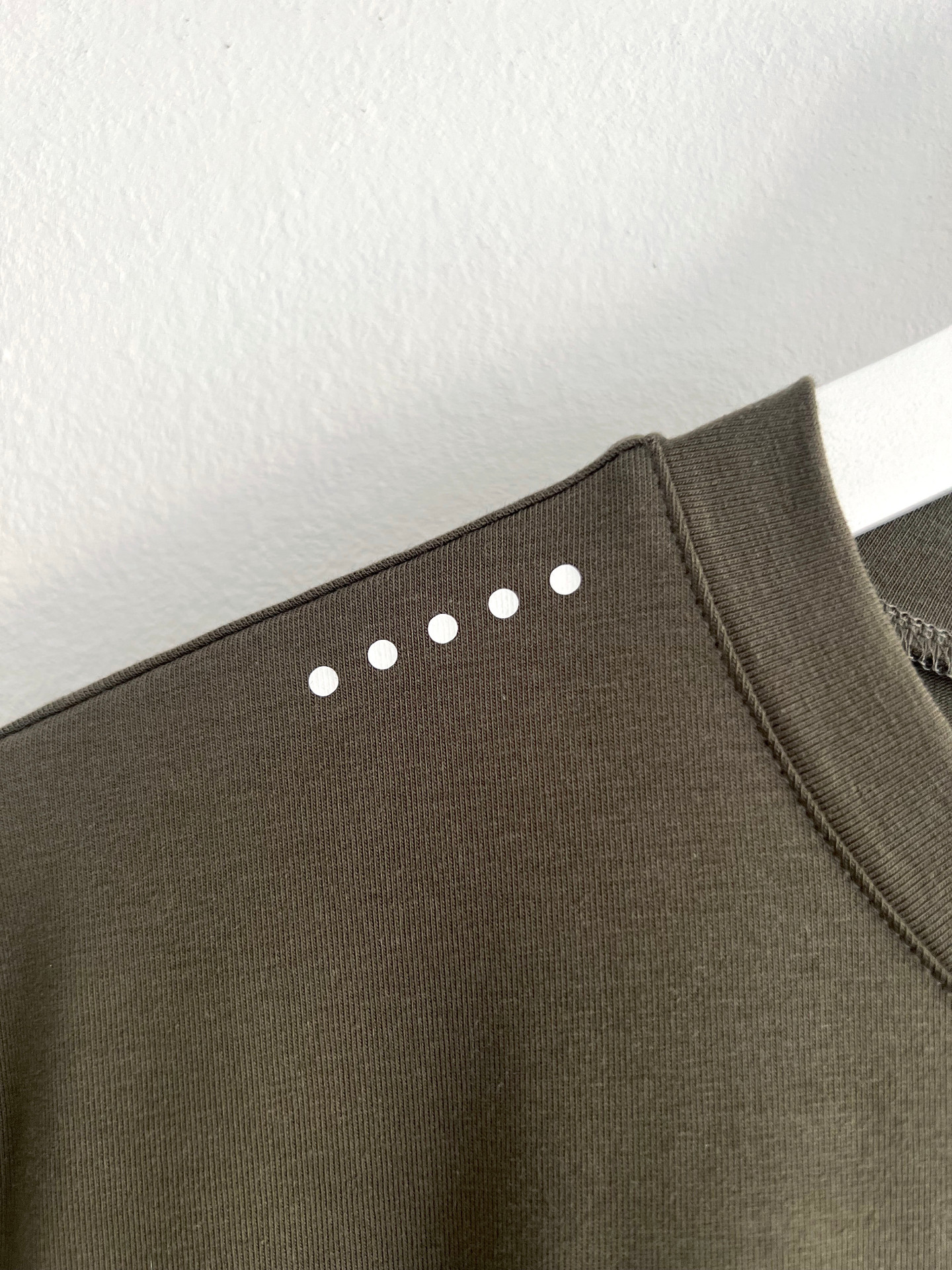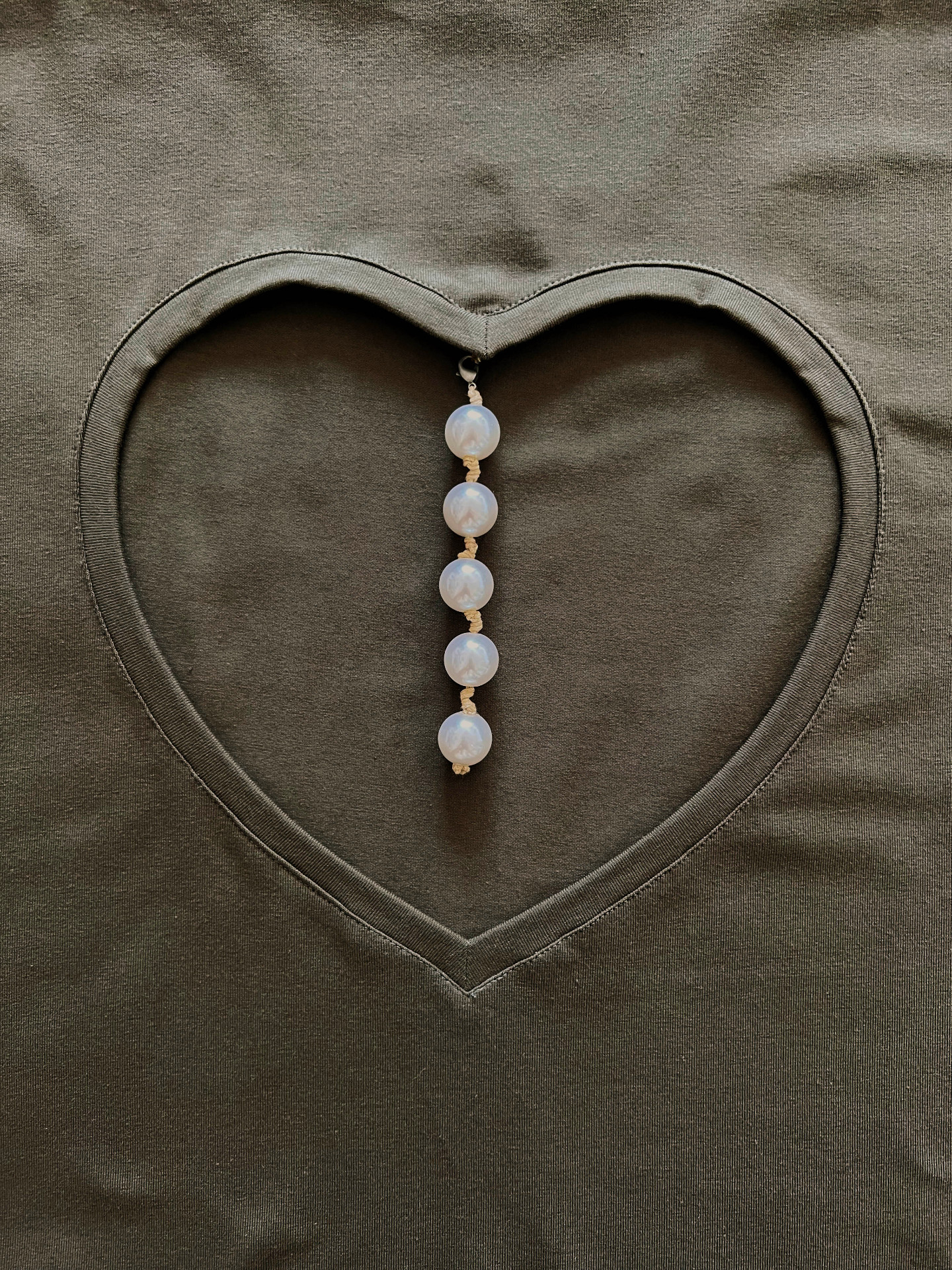 T-shirt obleka v olivno zeleni barvi z visokimi razporki na stranskih šivih. Na hrbtu obleke se nahaja detajl v obliki izrezanega srca iz katerega visi odstranljiv obesek iz petih voščenih perl.